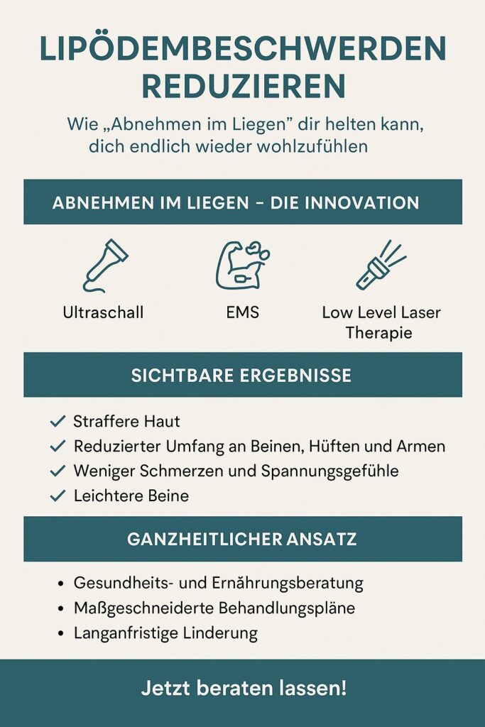 Wenn du deine Lipödembeschwerden reduzieren möchtest, ist das Konzept des „Abnehmens im Liegen“ ein echter Gamechanger. Es handelt sich um eine hochmoderne Kombination aus Ultraschall, EMS (Elektromuskelstimulation) und Low Level Laser Therapie (LLLT) – und sie alle arbeiten synergetisch, um gezielt die Symptome des Lipödems zu lindern.